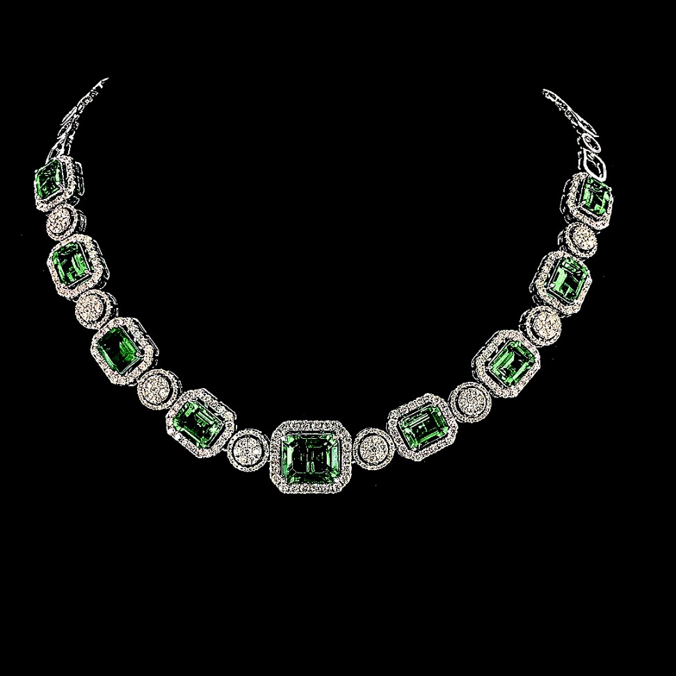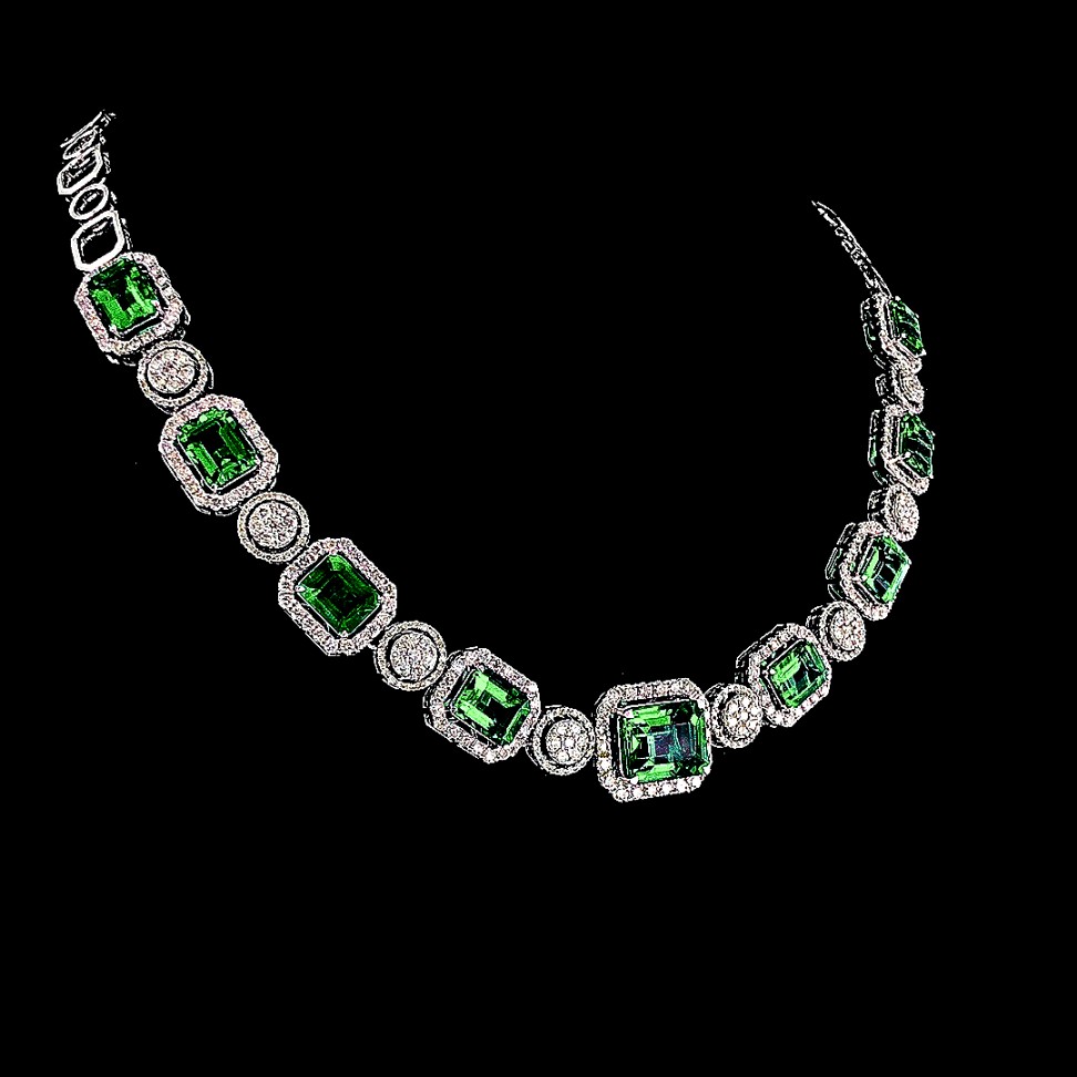The Emerald Enclave Necklace is a radiant expression of Raro’s commitment to blending classic glamour with modern sensibilities. This exquisite necklace features bold, emerald-cut green gemstones, each surrounded by a halo of sparkling diamonds set in an elegant silver frame.This piece is designed to capture the eye and enchant the spirit, with each gemstone representing a beacon of light and luxury. The vivid green of the emeralds symbolizes renewal and growth, making this necklace not only a statement of style but also of personal evolution and the flourishing of new beginnings.Crafted with precision and care, the Emerald Enclave Necklace is a testament to Raro’s dedication to ethical luxury. Each stone is meticulously chosen for its quality and sustainability, ensuring that the necklace is as responsible as it is beautiful.Perfect for those who appreciate a touch of color and the allure of finely crafted jewelry, this necklace is versatile enough to grace any occasion, from a formal event to a significant personal celebration. It’s a wonderful choice for anyone looking to make a bold statement while upholding values of environmental stewardship and ethical fashion.The Emerald Enclave Necklace by Raro is more than just an accessory; it is a symbol of commitment to beauty and sustainability, ensuring that every piece tells a story of care, luxury, and conscious choice.